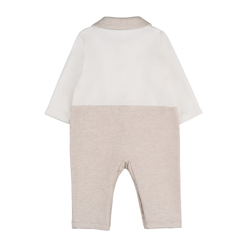 - A soft viscose-blend jersey romper with a beige collar, designed for special occasions. The light blue bow tie and matching buttons complete the piece with elegance. The clean lines and lightweight fabrics create a refined and comfortable look, perfect for those precious moments.