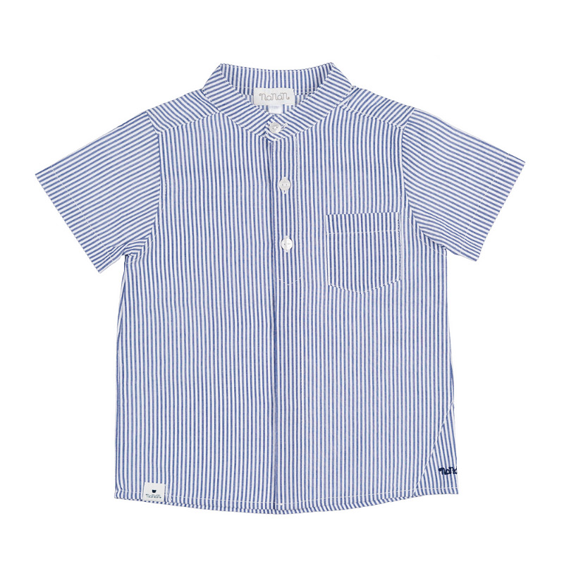 - Bue and white striped shirt, short sleeves, mandarin collar, and a side pocket. Soft and lightweight, it combines style and practicality.
