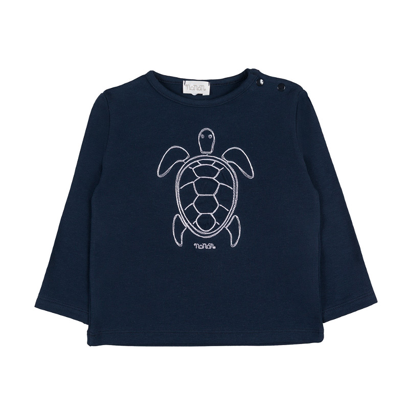 - Blue long-sleeved jersey T-shirt featuring a delicate turtle embroidery. Comfortable and versatile, perfect for little explorers.