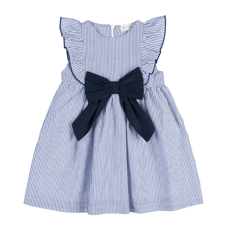 - White and blue striped dress with ruffled shoulder straps, a large front bow, and a matching back zip closure. Perfect for special occasions and summer and spring days.