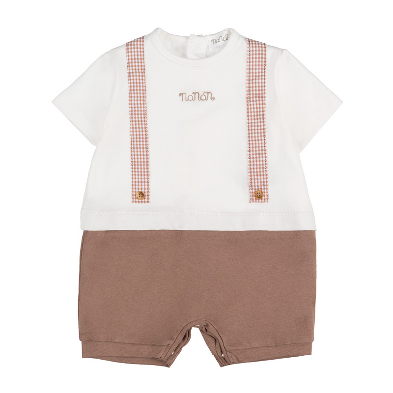- A two-piece romper with an off-white short-sleeve top, brown gingham suspenders, and brown shorts. Soft and comfortable, it combines fresh style and practicality for any occasion.