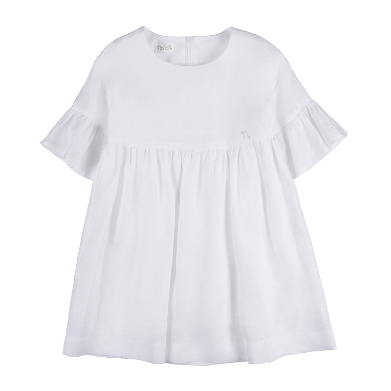 - Light and refined, this white linen dress features wide sleeves and a tone-on-tone back zip closure. Perfect for elegant and effortless summer looks.