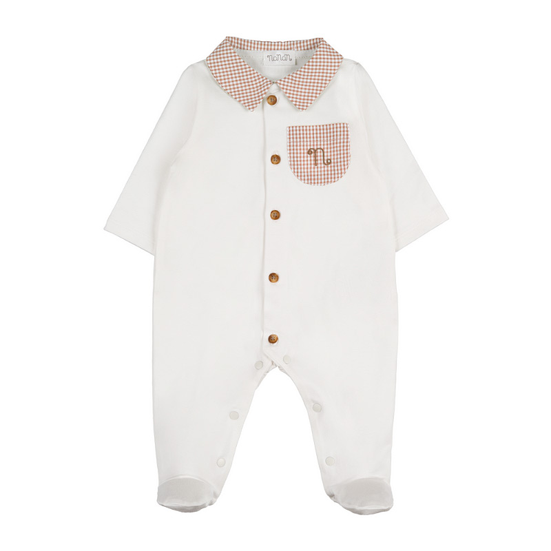 - Soft off-white jersey babygro with a front opening, brown gingham collar, and pocket. Comfortable and refined, it combines sweetness and style for any occasion.