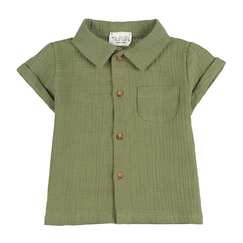 - Green organic cotton ensemble featuring a short-sleeved shirt with a front opening, collar, and small side pocket, paired with elasticated shorts. Cool and comfortable, it combines naturalness and style for a refined and sustainable look.