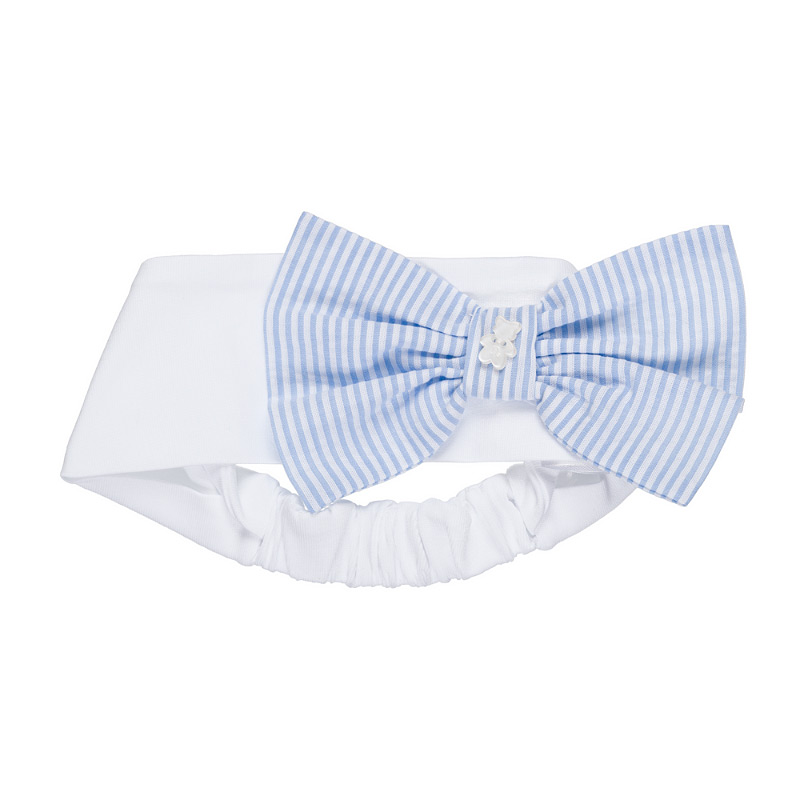 - A white headband in soft fabric, embellished with a light blue and white striped bow that adds a fresh and refined touch. The perfect accessory to complete elegant and coordinated summer looks.