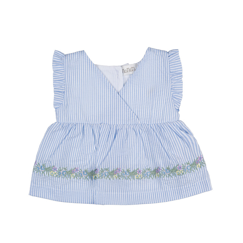 - Light blue and white striped dress with matching culottes in the same fabric. The style features ruffled sleeves that add lightness to the design and delicate embroidery on the front that adds a refined touch.