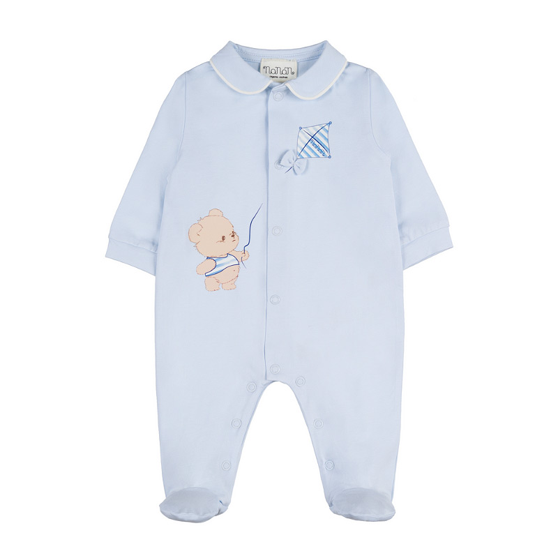 - Light blue babygro with a matching collar and off-white piping, featuring a cute teddy bear and kite graphic. A soft and refined piece, designed for elegant comfort from day one.