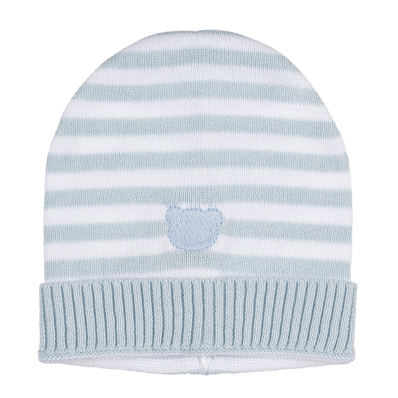 - Light bue striped cotton hat, embellished with a cute, matching embroidered teddy bear. Soft, comfortable, and perfect for completing first looks with sweet elegance.