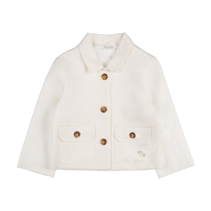 - Clean-cut off-white linen jacket with practical side pockets and refined details. The embroidered 'N' adds a distinctive and refined touch, perfect for completing elegant and contemporary looks.