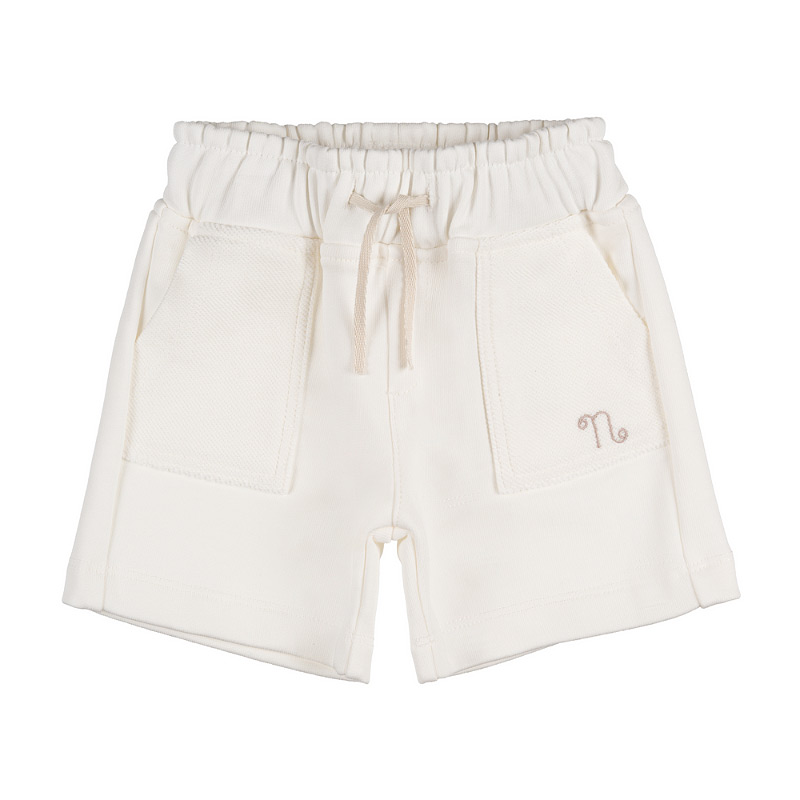 - Off-white fleece shorts with a drawstring waist and side pockets. Soft and comfortable, perfect for a casual and cozy look.