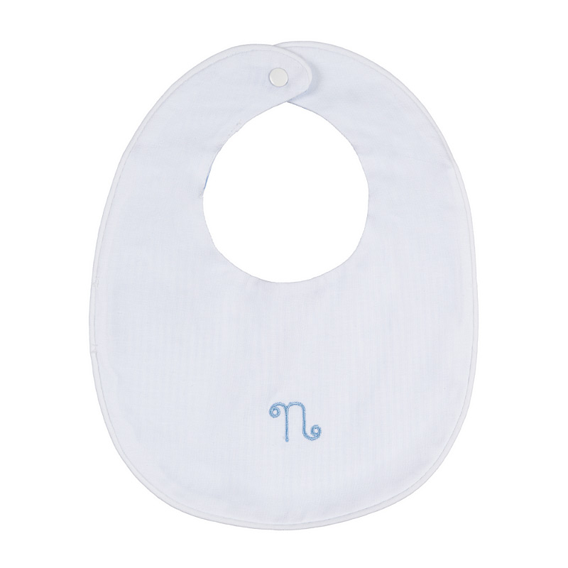 - Reversible bib: one side is plain white with white piping and white embroidery; the other side is light blue and white stripes with white piping. Soft and practical, it combines style and functionality.