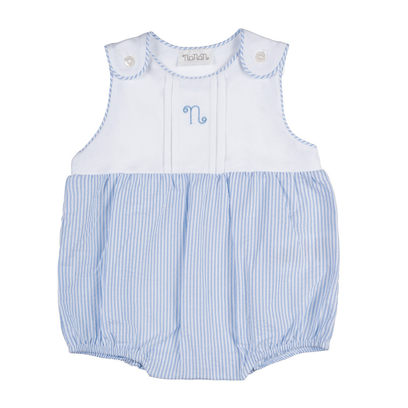 - A soft white jersey romper with striped piping and blue and white striped inserts, embellished with delicate white embroidery. Soft and comfortable, it combines style and sweetness.