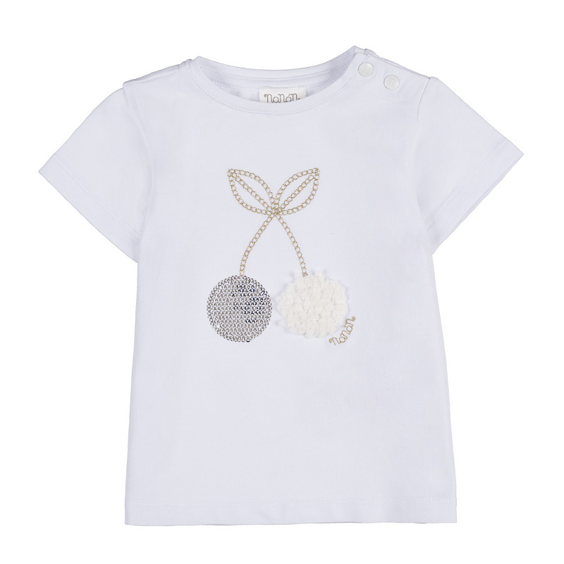 - White T-shirt with cherry graphics and rhinestone and petal appliqués. Perfect for fresh and playful looks.