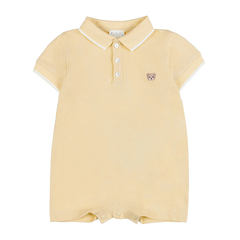 - Short yellow pique romper with a collar, front button fastening, and a delicate embroidery of a sweet little teddy bear. Soft and refined, it combines sweetness and style in an elegant piece.