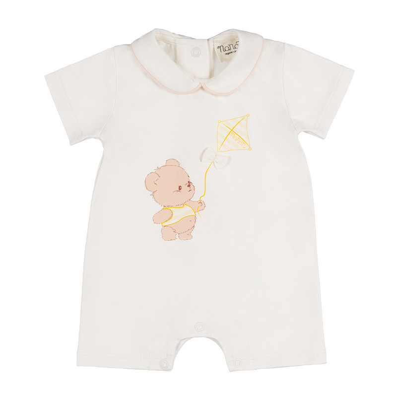 - Off-white romper with a matching collar, off-white piping, and a cute teddy bear and kite graphic. A fresh and refined piece, perfect for those special first moments.